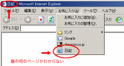 理由は「日記」だけではどこの誰の日記かわからないからです。タイトルはブラウザのタイトルバー以外にも、ブックマークや検索結果の表示に使われます。タイトルが「日記」では誰も見てくれないでしょう。(T_T)