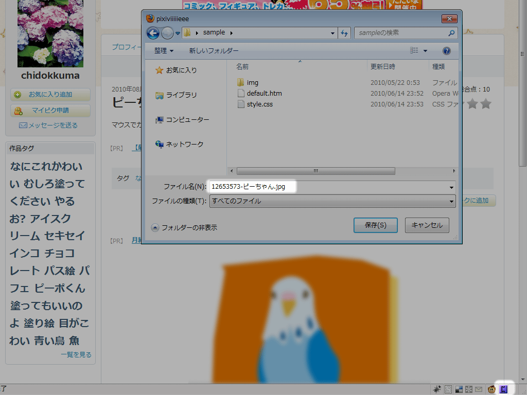 pixiv以外の場所でも思いついた時すぐ「タグ検索したい」という中毒者向け。Firefoxをお使いの方は、Add to Search Barインストール後pixivの検索バーを右クリック→サーチバーを追加→検索エンジンの追加から名前とキーワードを入力してOKを押してください。これでpixivが検索バーに追加されます。ここではキーワードにpを当て嵌めたのでロケーションバー(F6から呼び出し可)から「p セキセイインコ」のように検索できるようになりました。